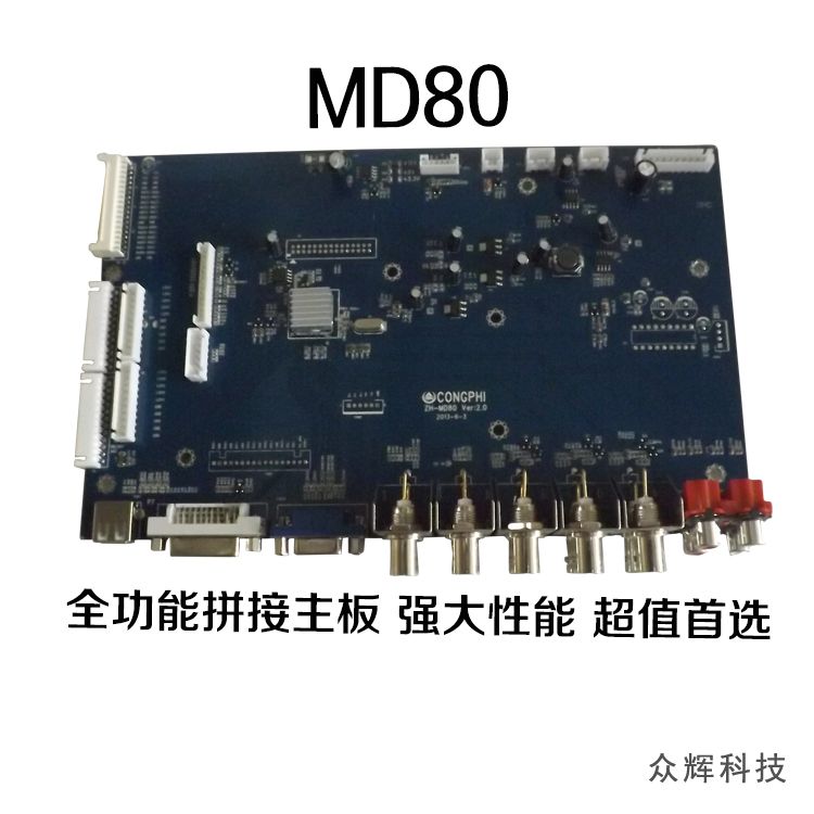 ZH-MD80 是專為簡單拼接和液晶監視器而設計,采用182VG芯片,比V56和V59高出一個檔次,畫質更細膩更穩定,內置1GBDDR3 內存,主頻高達1333MHz。高性能的CPU,強大的3D 處理功能,配上高性能高速內存,讓圖像完美再現。該芯片支持PAL,SECAM,NTSC 制式視頻信號,提供AV 、YPbPr、VGA、DVI 接口輸入,全面支持1080P 高清信號輸入,支持WUXG全高LCD 和同等規格PDP,具有強大的數字音頻功放,提供2×7W 4Ω的輸出功率。